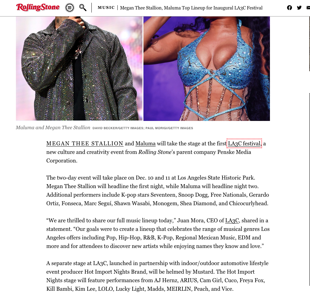 Freya Fox to perform at the Hot Import Nights stage at the inaugural LA3C festival produced by Penske Media (PMC). Headliners include Megan Thee Stallion, Maluma, and Snoop Dogg